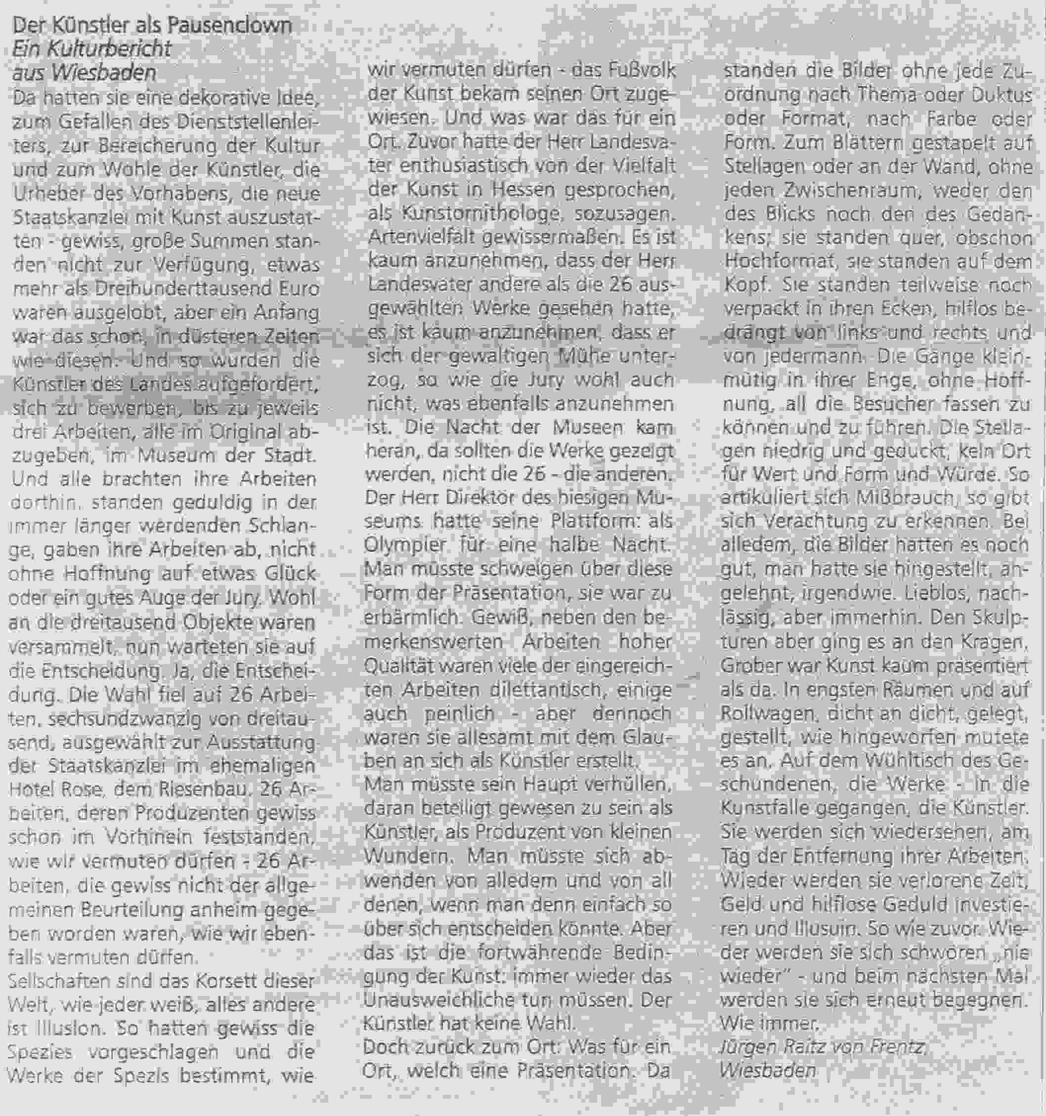 Herr von Freritz spricht sicherlich vielen KünstlerInnen aus der Seele, die sich an der Aktion “Kunst für die Rose” beteiligt haben. Vielen Dank für diesen Leserbrief.